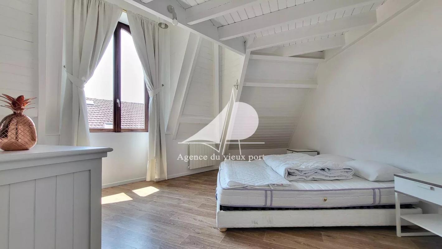 Agence du Vieux Port Pornic, à vendre : centre ville Pornic, idéalement situé : bel appartement duplex à vendre au dernier étage d’un immeuble ancien. Il comprend : une entrée sur salon-séjour, une cuisine américaine aménagée et équipée ouverte sur un balcon, lingerie, une chambre et une salle de bains avec WC. A l’étage : une mezzanine, deux chambres mansardées, un WC. Une cave en sous-sol.